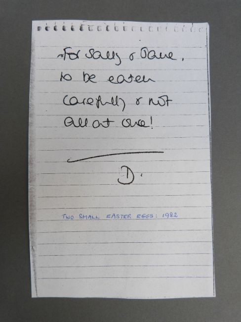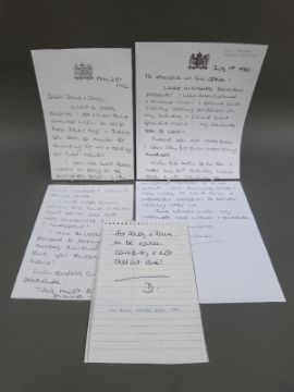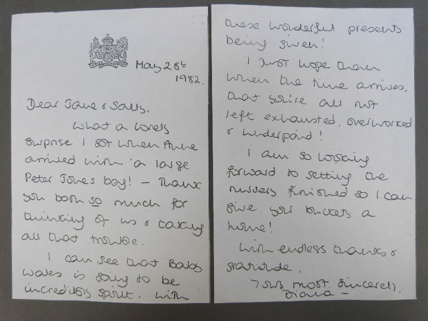 Several facsimile letters from Princess Diana including a note 'For Sally and Jane, to be eaten carefully and not all at once!' and initialled D, with script in the recipient's hand, 'two small Easter eggs 1982' below. Further letters from Diana to 'Everyone in the Office' July 5th 1982 thanking the staff for her 21st Birthday presents, their overwhelming kindness and gratitude at having such a 'wonderful collection of people looking after us' and another letter to Sally and Jane giving thanks for nappy buckets and finishing the nursery so she can give the buckets a home! She also hopes the staff are not left exhausted, overworked and underpaid after the birth