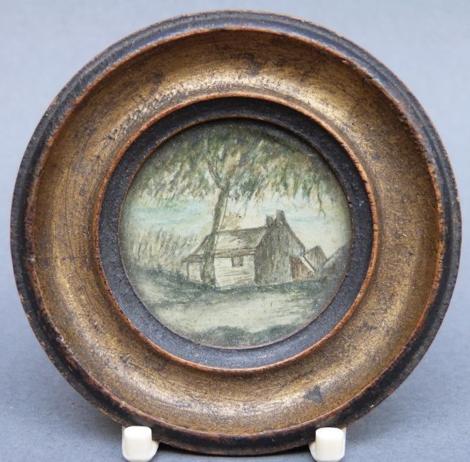 George III miniature watercolour landscape dated verso 1785, diameter 3cm