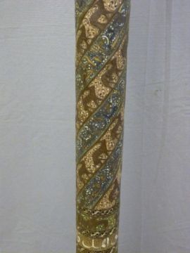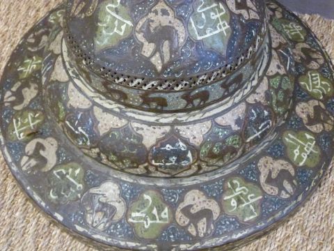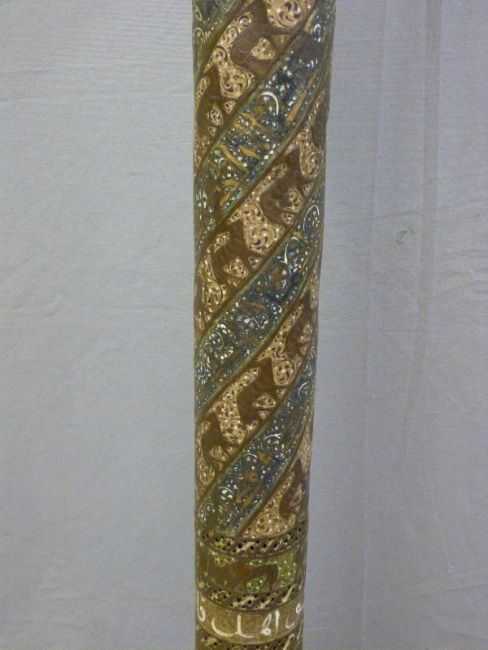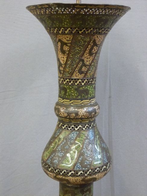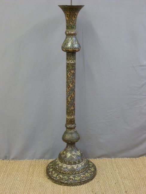 Islamic Cairo ware Mosque lamp with trumpet neck and long cylindrical body leading to a flared circular foot, pierced throughout and with stylised motifs and calligraphy in copper and silver inlay, 160cm tall.