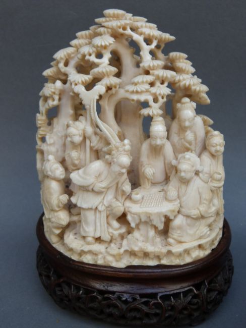 A 19thC Chinese carved ivory figural group depicting figures playing board games and a horse in a wooded area, on carved hardwood base, 13cm tall