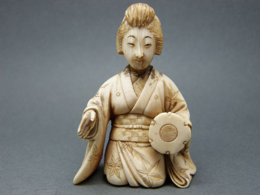 A Japanese Meiji period ivory okimono of a lady playing a drum, 5.7cm tall