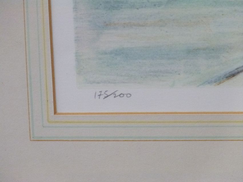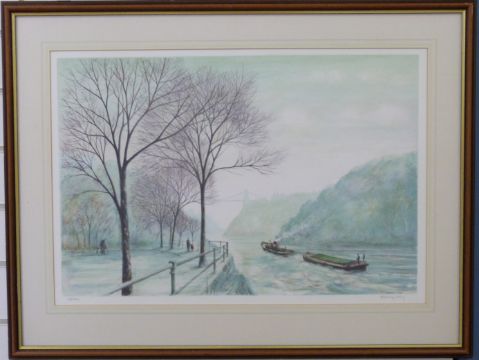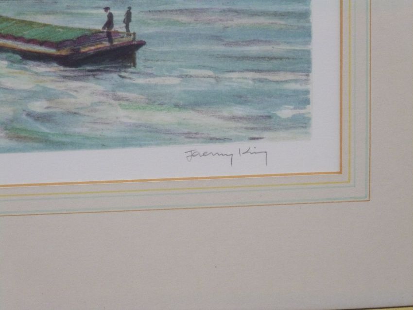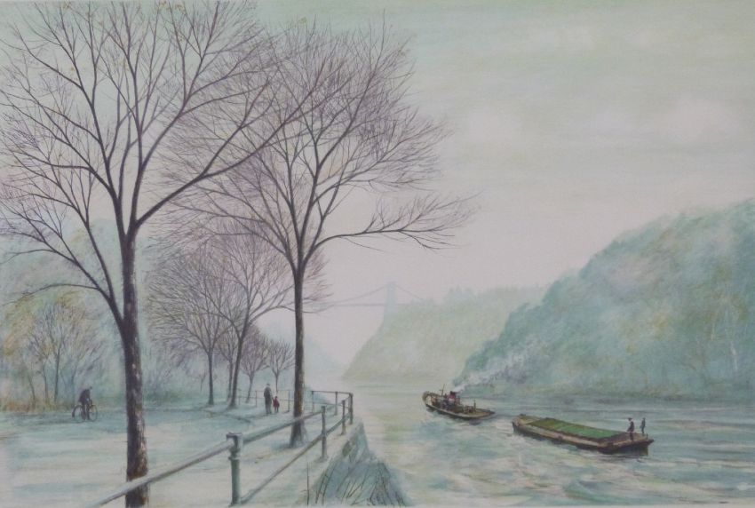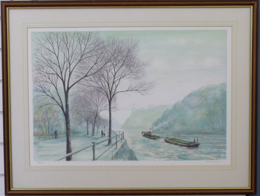 Jeremy King signed limited edition (175/200) print of a tug and barge on the Avon by the Clifton Suspension Bridge, 43 x 63cm