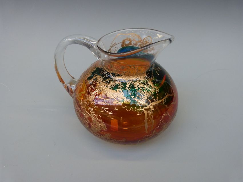 Eisch glass jug with amber and turquoise staining and gold trailed decoration, 19cm in diameter.