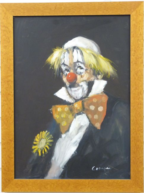 Caven Corrigan (b.1946) oil on board clown, signed lower right, 62 x 44cm