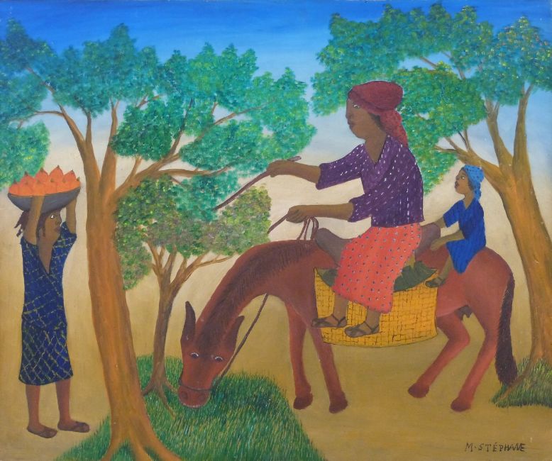 Micius Stephane (Haiti 1912-1996) oil on board lady and girl on horseback with lady carrying fruit, signed lower right and marked/dated 9-22-10 verso, 50.5 x 60.5cm