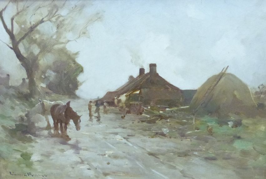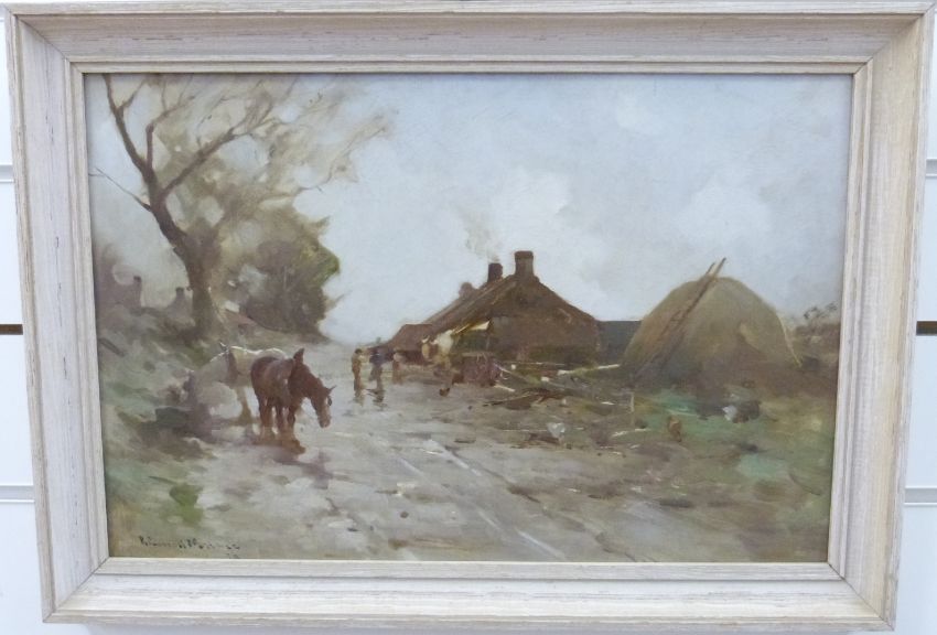 Robert Russell Macnee (Scottish, 1866-1952) oil on board of horses and figures in a rural village signed bottom left, 30.5 x 45.5cm.