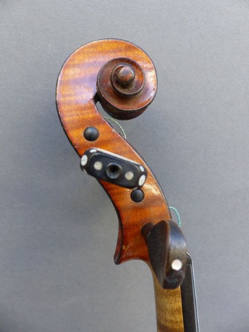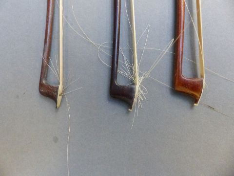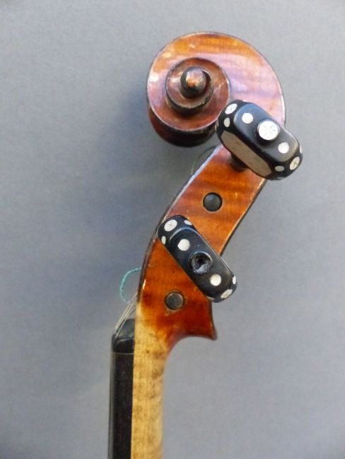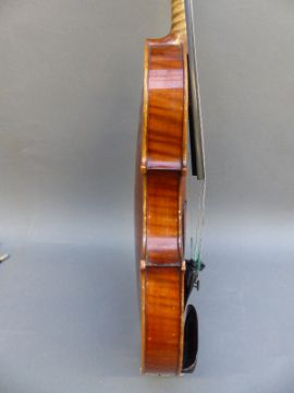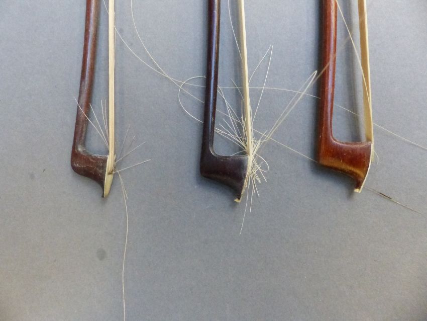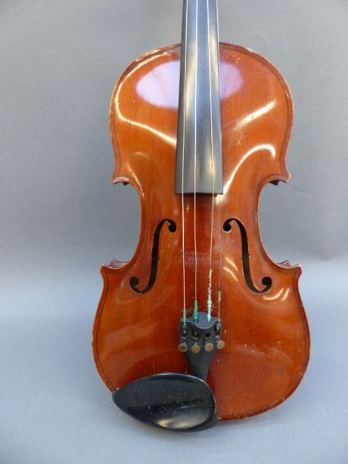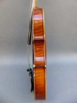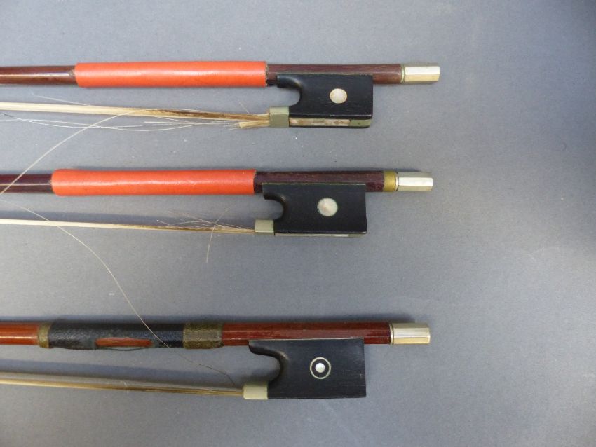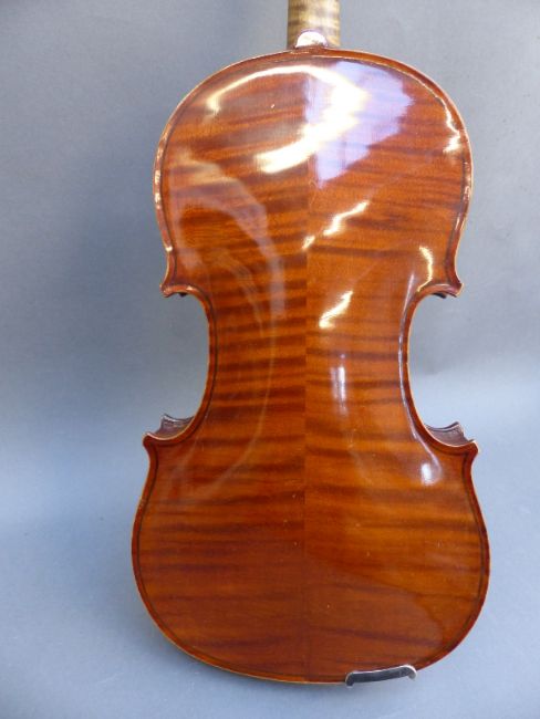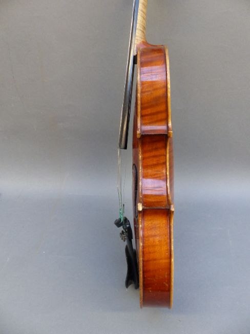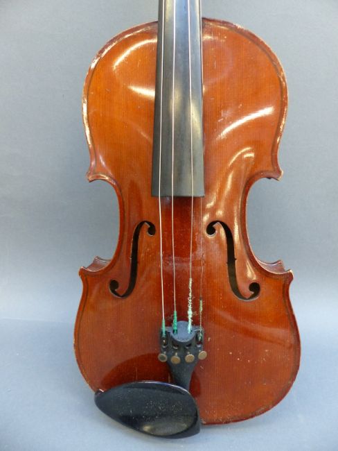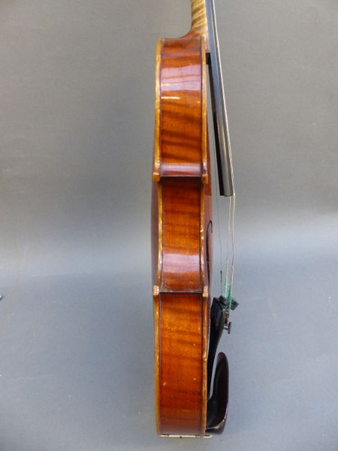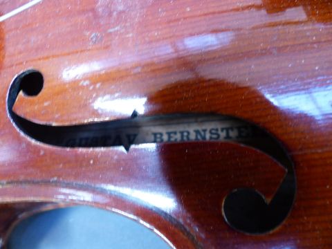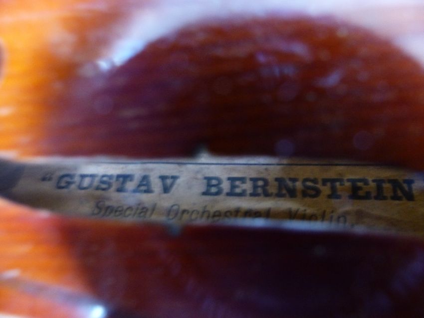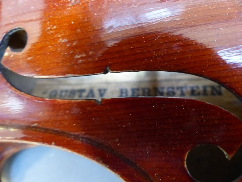 An early 20thC violin with two piece 36cm flame back, vendor's grandfather Sydney Cole played in a jazz band ('The Brooklyn Band) in the 1920's and through the war up to 1973 Labelled Gustav Bernstein, Saxony anno 1904, together with three bows