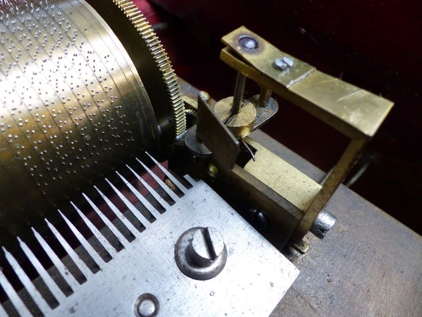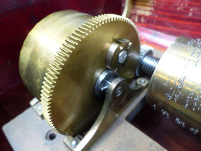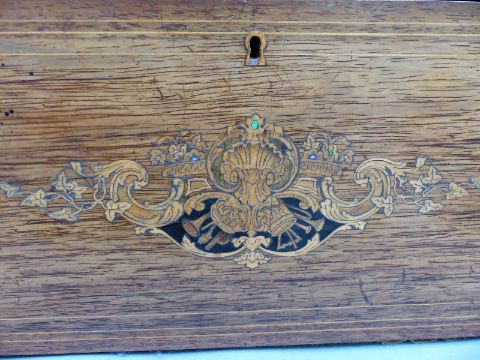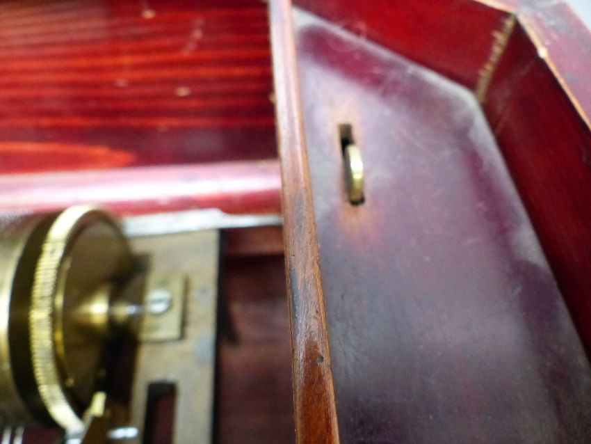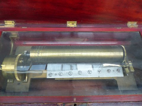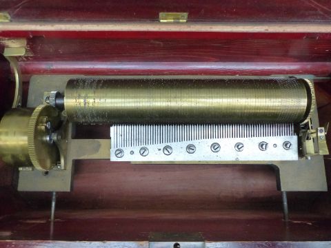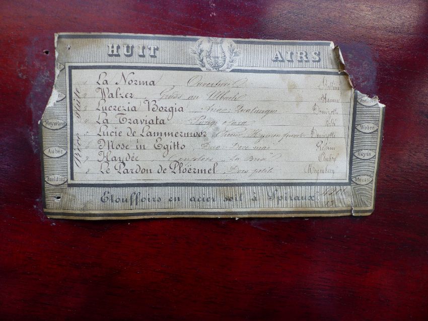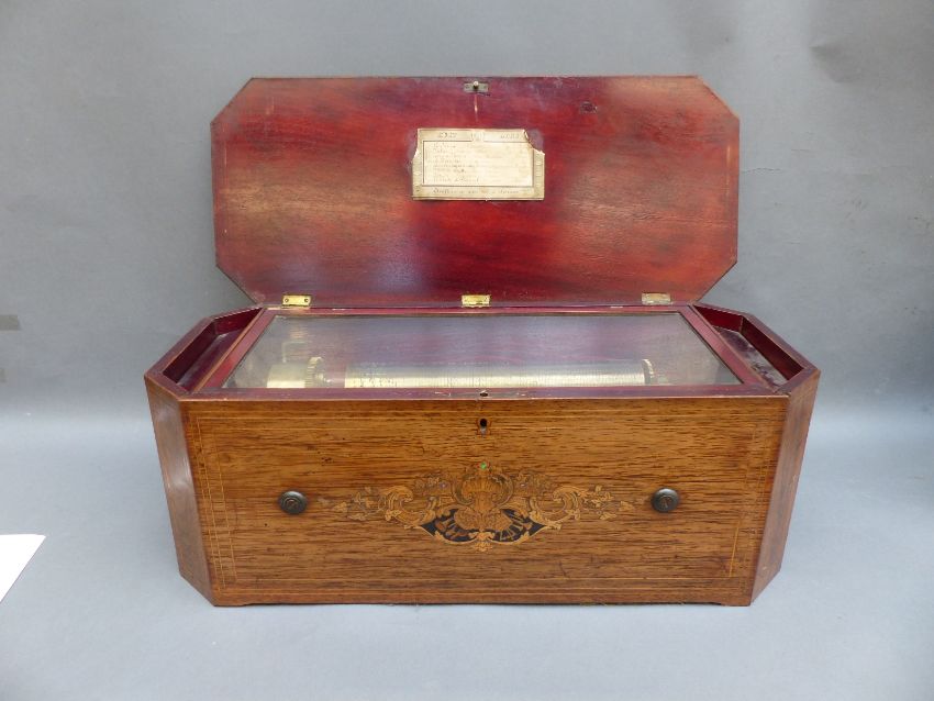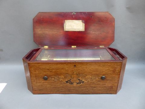Mermod Freres organ musical box (organ mechanism missing) c1870 with 8 air cylinder playing on a standard comb with tune sheet to the underside of the lid, stop/start and repeat controls and lever winder. Finished in an unusual case with inlaid decoration to the lid and front. Organ boxes were popular during the mid-19th century with the comb an extra complement to the organ section