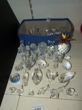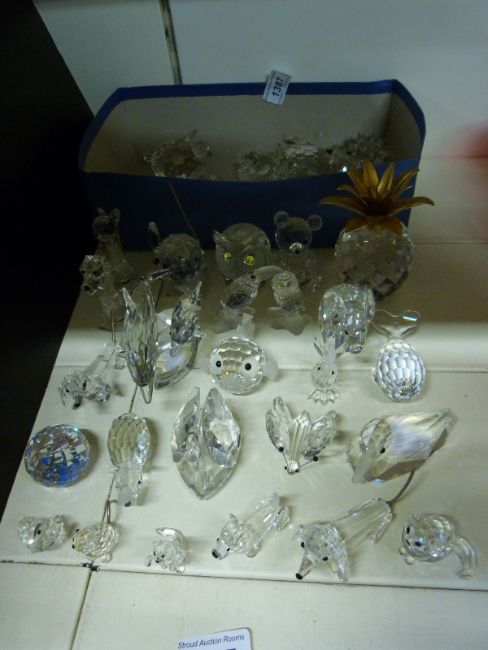 A collection of Swarovski crystal animals to include dolphins, whale, cats, dogs, rhino, elephant, swan, cockerel, goldfish, toucan, duck, swan, pineapple etc, approx. 33 in total