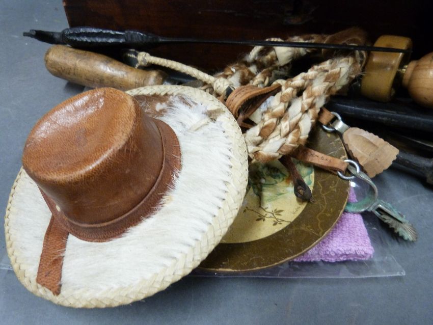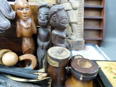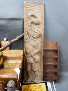 A parcel lot of treen to include boxes, carved panel of Sancho Panza, pipe, African figures, leather driving/flying gauntlets etc