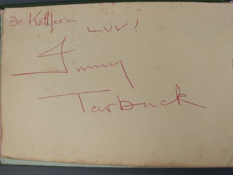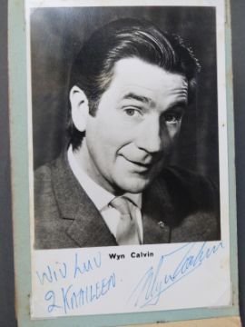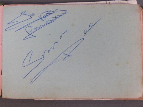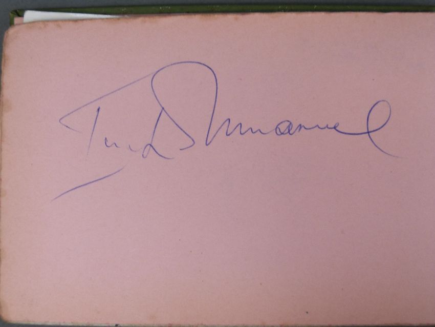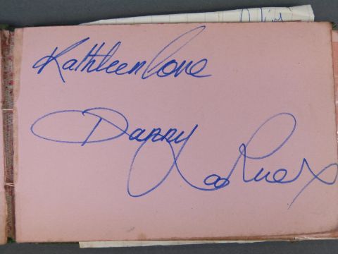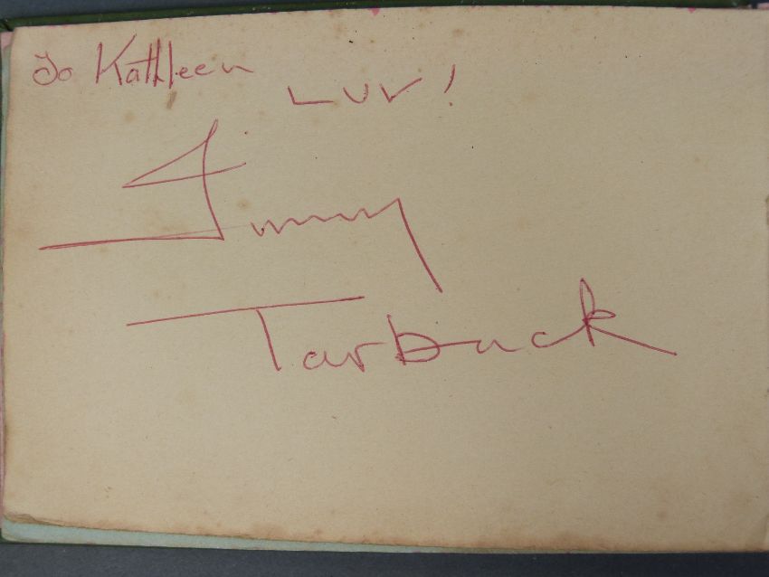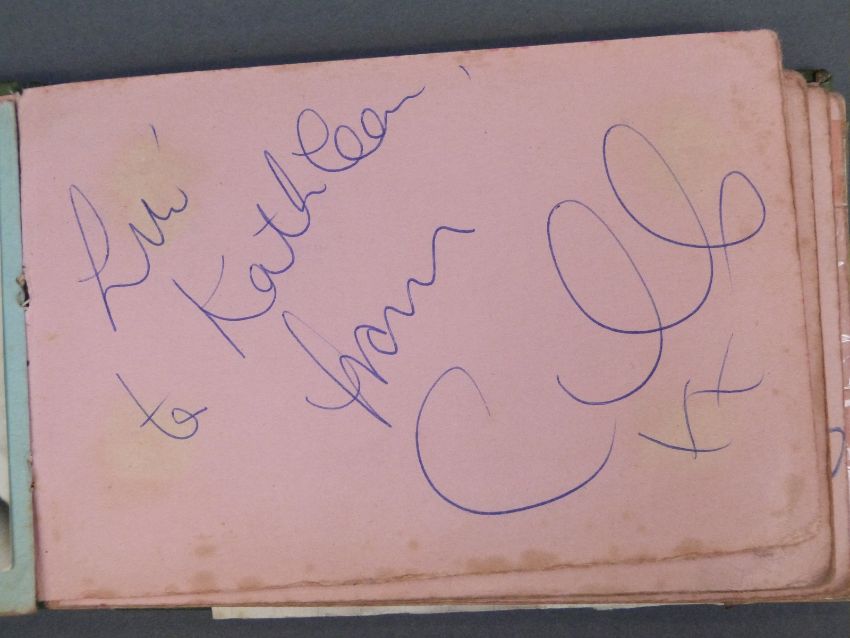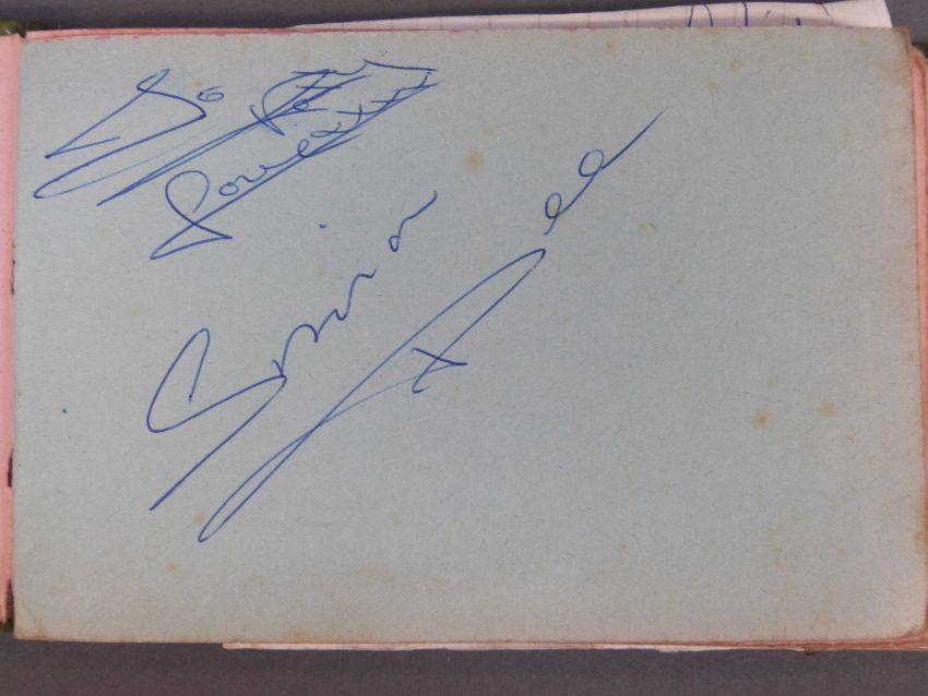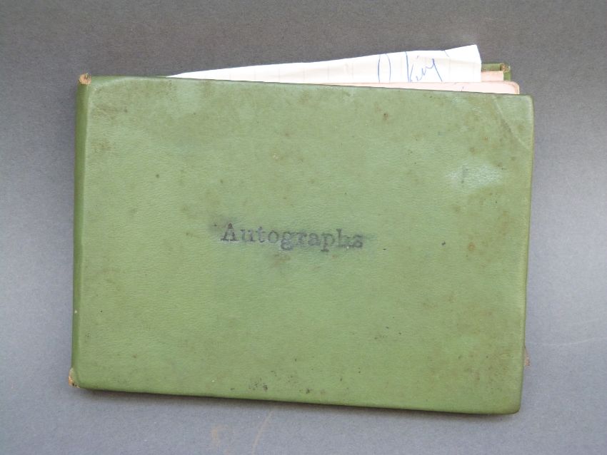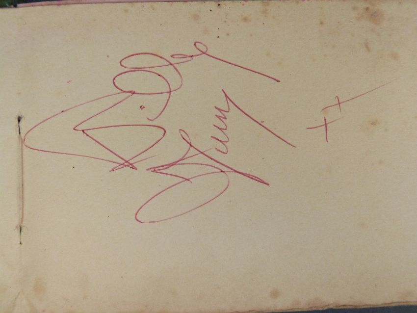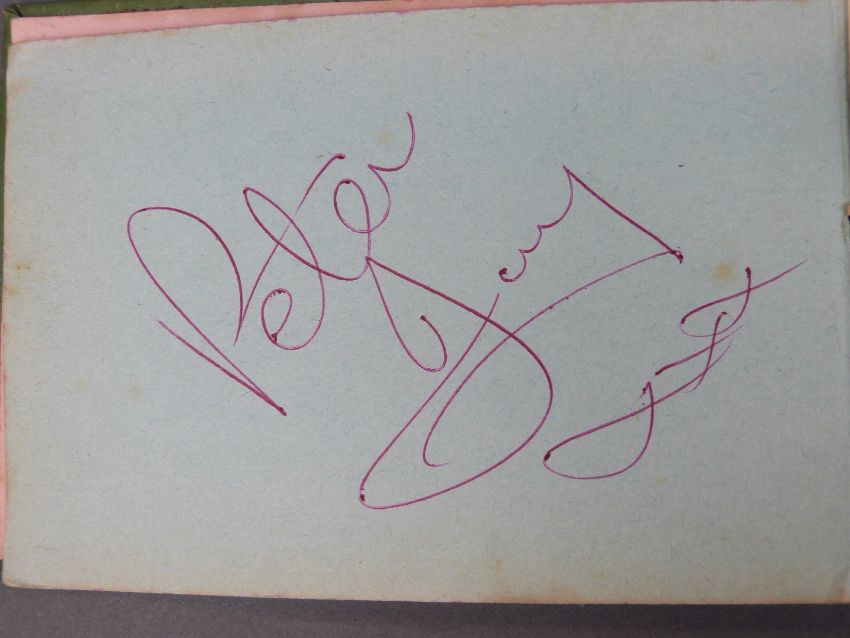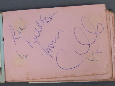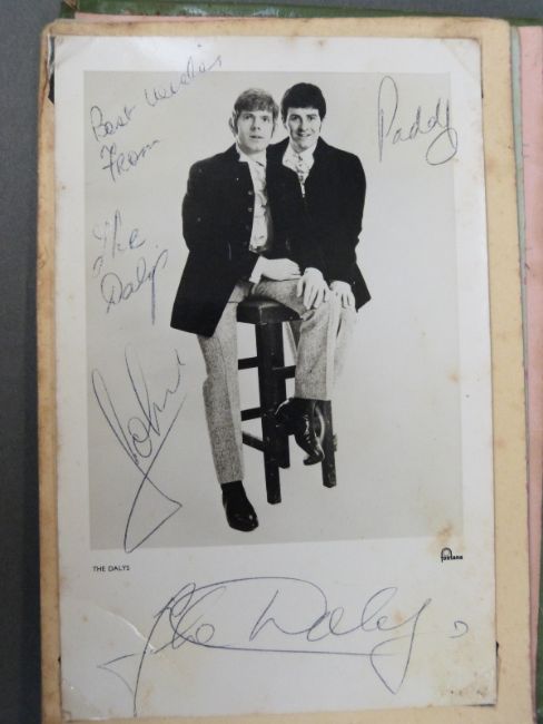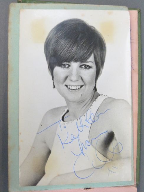 An autograph book containing autographs and some photos of various 'Stars of the 50s and 60s' pop singers, comedians, disc jockeys etc to include Simon Dee, Peter Jay, The Gibsons, Jimmy Tarbuck, Bill Fury, The Daleys, Cilla Black with photo, Frankie Vaughan, Jimmy Clitheroe, The Paper Dolls, Den Dodd, Norman Wisdom, Freddie Starr, Mrs Mills, Danny La Rue, John Inman, Wyn Calvin, Mike and Bernie Winters, Val Doonican, Dick Emery, Larry Grayson, Robert Powell etc