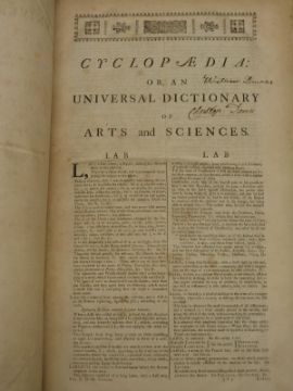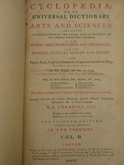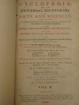 Cyclopaedia or, an Universal Dictionary of Arts and Science containing an Explication of the Terms, and an account of the things signified thereby; in the Several Arts, both Liberal and Mechanical; and the Several Sciences, Human and Devine by E. Chambers, Printed for W. Innys, J & P. Knapton, S. Birt, D. Browne etc 1751 in 2 volumes being the 7th edition corrected & amended. Engraved plates (some foldout) Half leather marbled boards with raised spine bands.