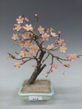 A celadon glaze pot with a rose quartz prunus tree 25cm tall
