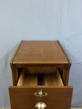 A vintage four drawer wooden filing cabinet with brass cup handles and reeded columns (H135 x W53 x D72cm)