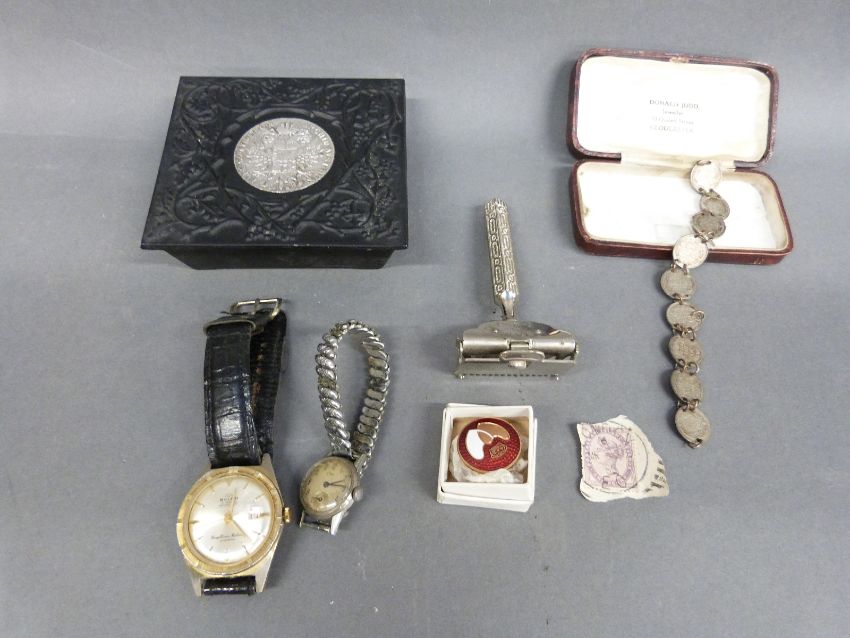 A Maria Theresa coin set into the lid of an embossed metal box, together with a silver Dutch coin bracelet, two watches etc.