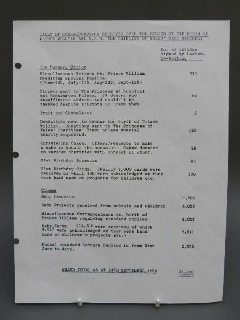 A typed 'tally of correspondence received over the period of the birth of Prince William and HRH The Princess of Wales' 21st Birthday'; an interesting record of the level of interest in the Royal family, detailing eighty three gifts of flowers, four thousand five hundred baby presents, over 24,000 thank you letters sent by the ladies in waiting.