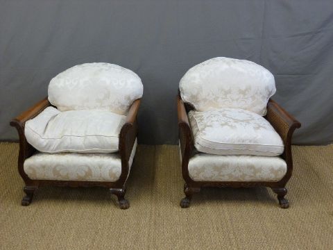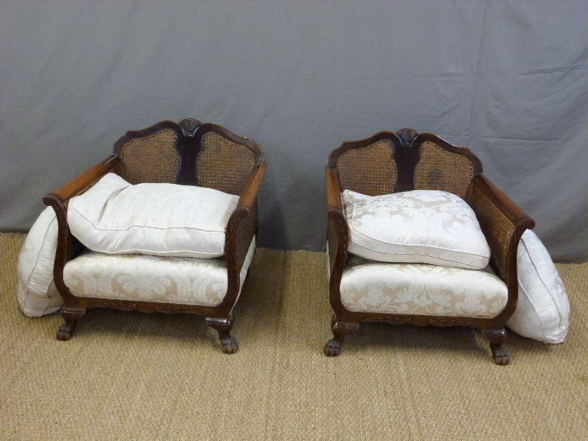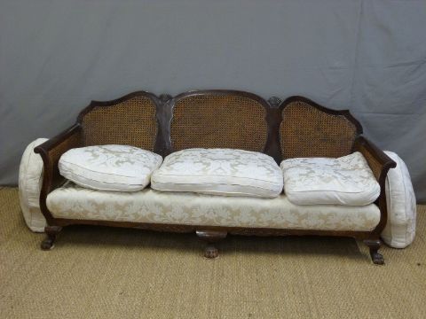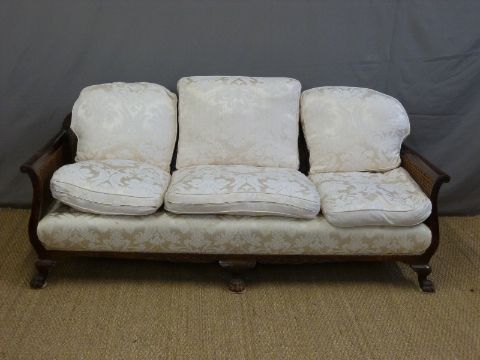 A 19thC/20thC bergere three piece suite with loose cushions, raised on ball and claw feet