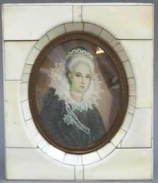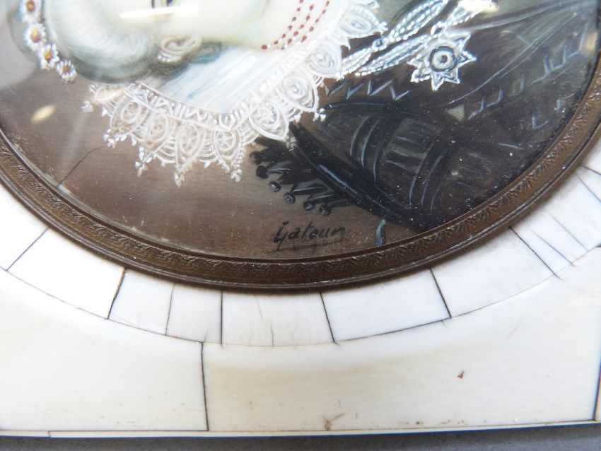 A 19thC portrait miniature on ivory of a lady with jewels and frilled robe wearing an order, signed Latour, max diamter 18cm