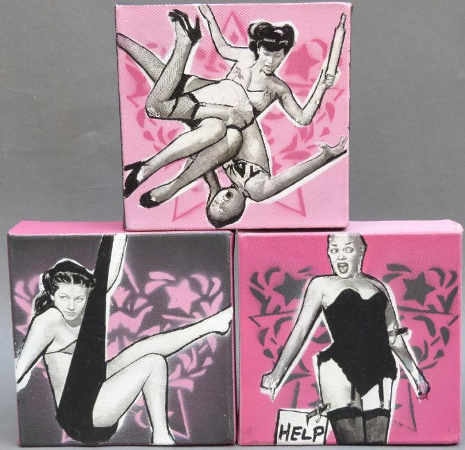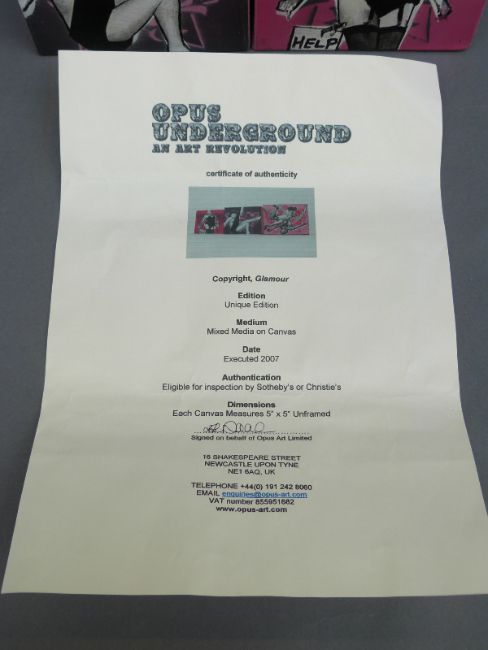 Three mixed media oil on canvas 'Copyright, Glamour' by Orpus Art with certificate, each 12.5 x 12.5cm