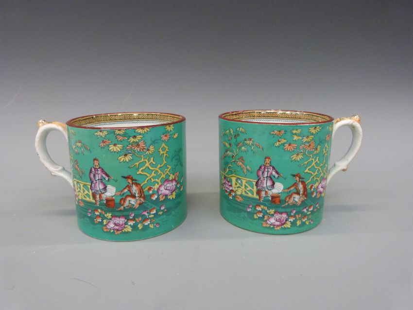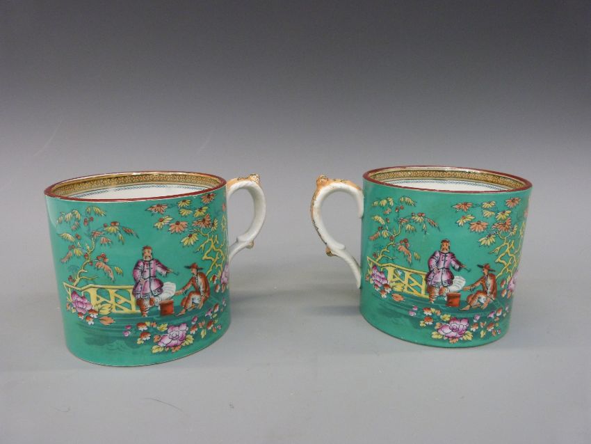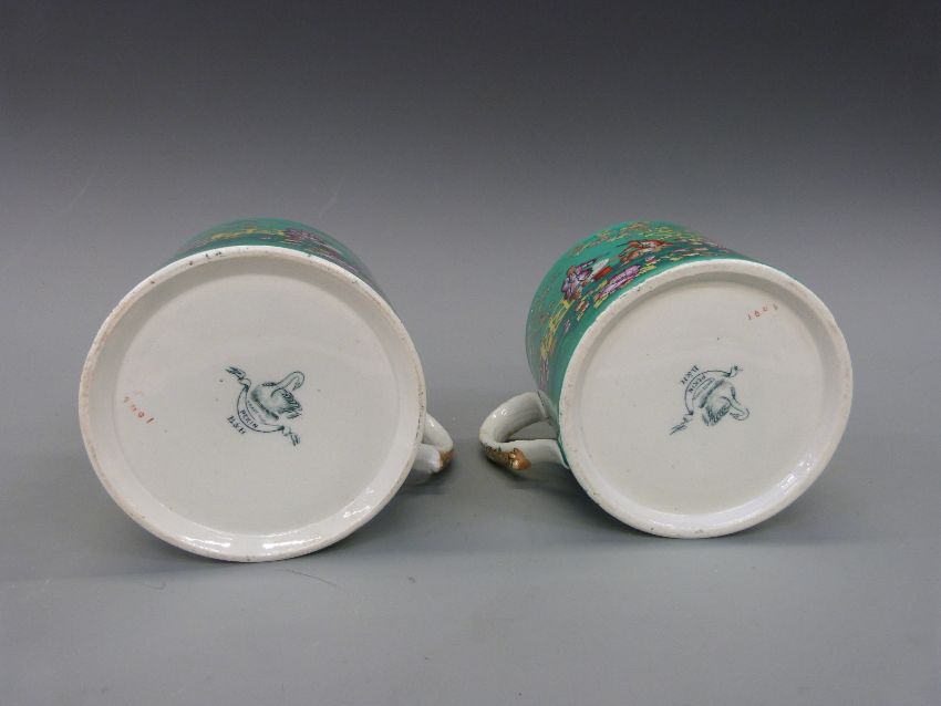 Pair of 19thC earthenware tankards by Blackhurst & Hume, with print & enamel decoration of Chinoiserie scenes on a green ground, marked 'B & H Pekin', approximately 10cm high