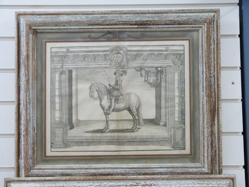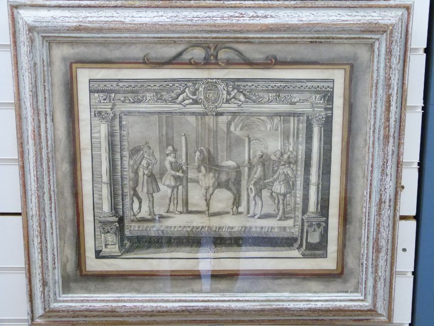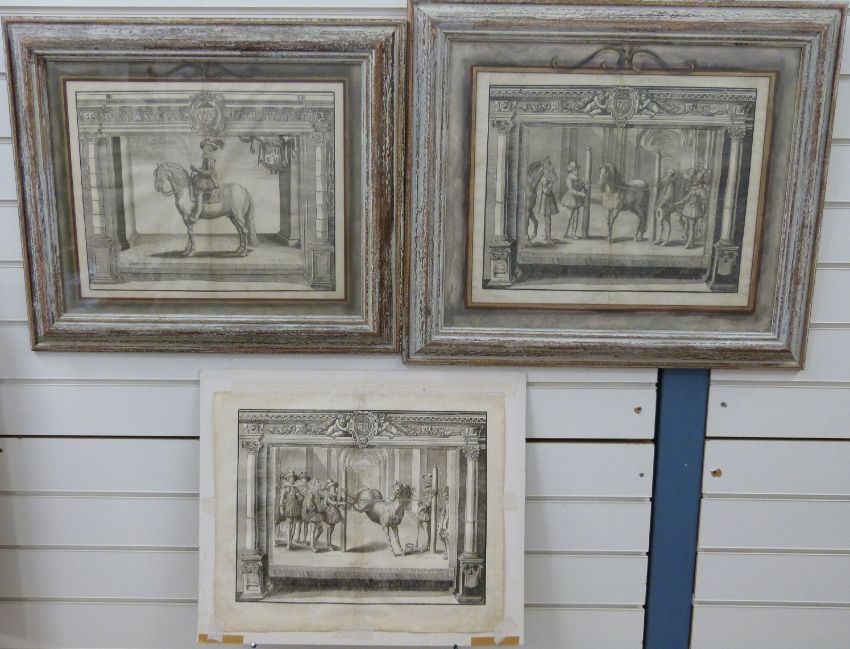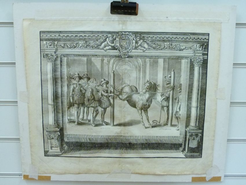A pair of 17thC first edition copper plate engravings by Crispijn de Passe II from Antoine De Pluvinel 'L'instruction du Roy en l'Exercice de Monter a Cheval' circa 1629, together with an unframed example, 34 x 44cm