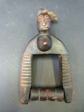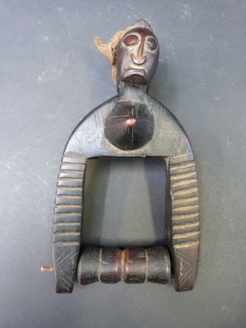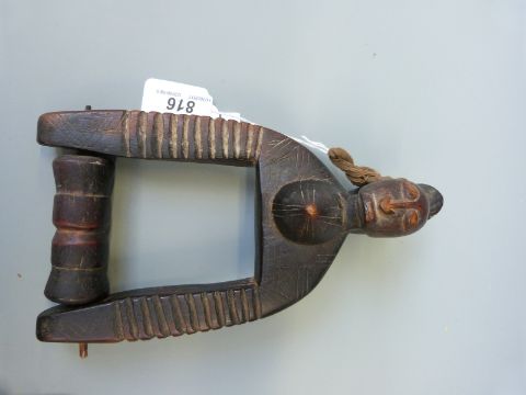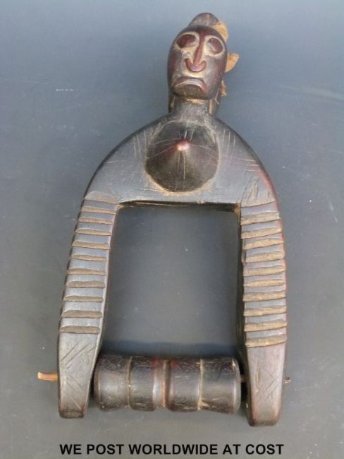 An African twin headed carved hanging figure with revolving pulley spindle, 25cm tall