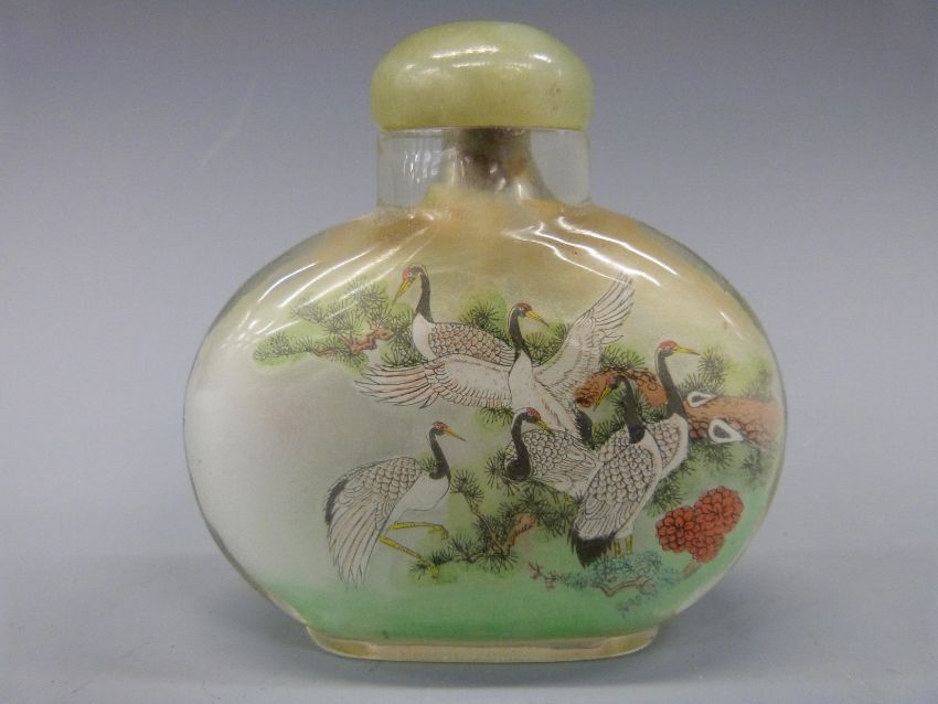 Chinese reverse painted glass scent bottle with hardstone stopper, 11cm tall