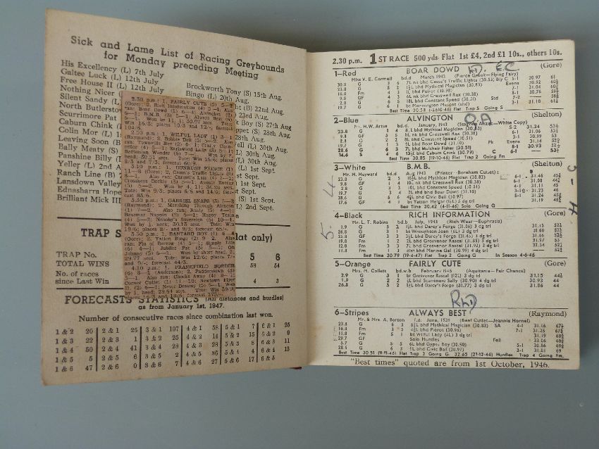 Greyhound Racing, group of Official Programmes from the Gloucester & Cheltenham Greyhound Club, Saturday 6th September 1947 to October 1947. Collection of 16 issues bound into one volume.