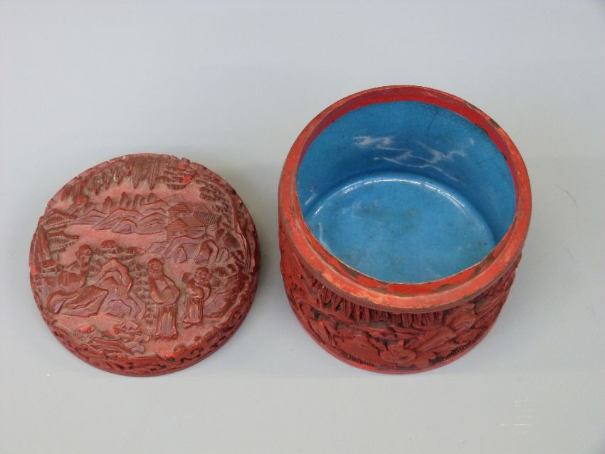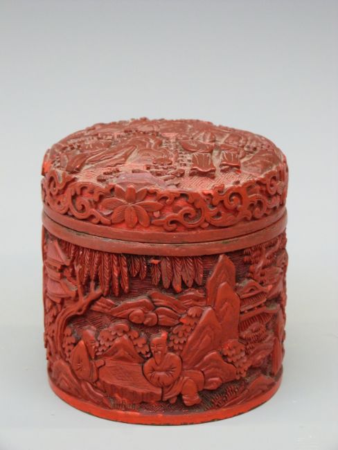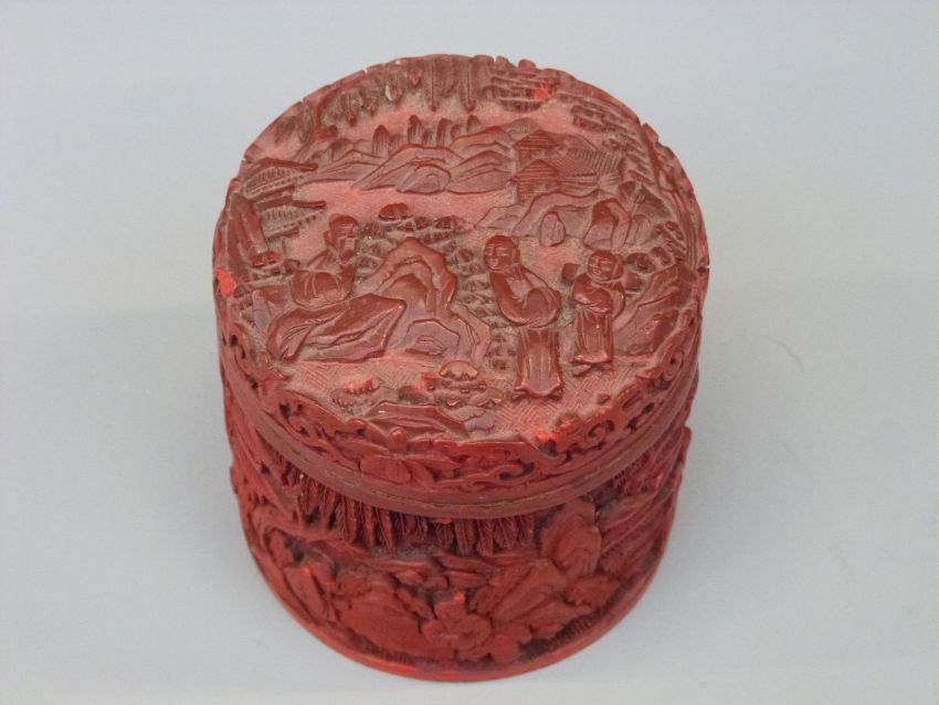 A 19thC/20thC Chinese cinnabar covered copper pot decorated with Chinese scenes, 9cm tall
