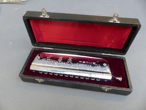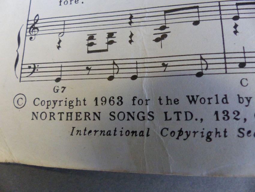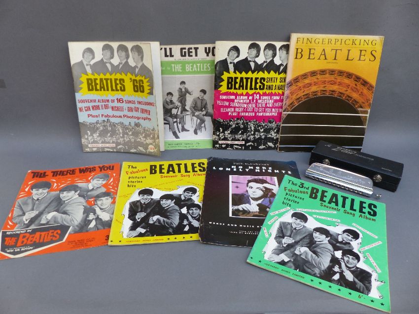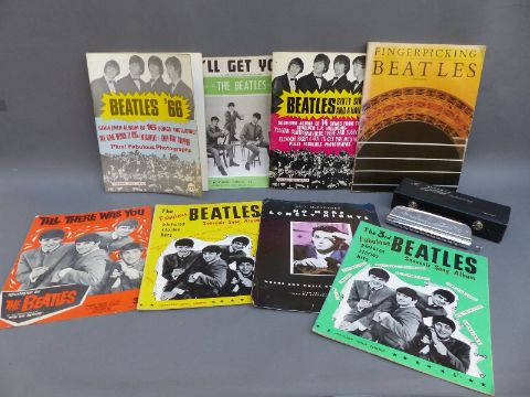 Beatles music books c1963 onwards to include 'I'll Get You', 'Till There Was You', Song Album etc together with a chromatic 12 hole cased Lark harmonica and a signed photograph and 'doodle board' by Rolf Harris when he visited a Gloucester school