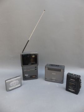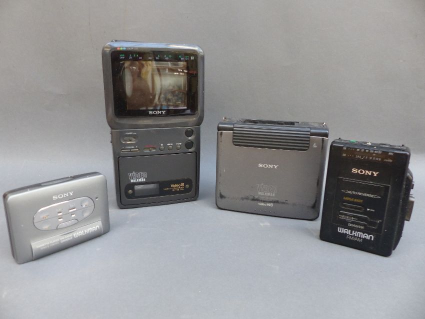 Four Sony Walkmans to include video H18, video TV recorder GV-9E PAL, cassette player Groove WM-EX552 and a cassette/FM/AM radio example