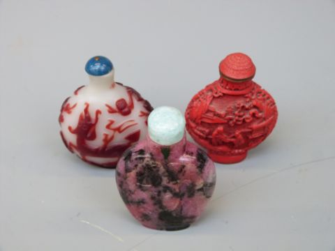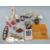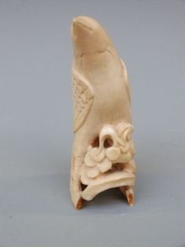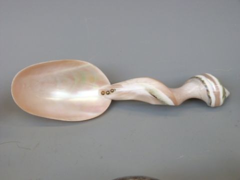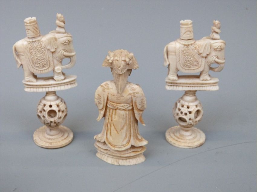 A collection of 19thC ivory figures including Japanese, Indian puzzleball chess pieces, modern jade style figures, a riveted spoon made from a conch shell, North American Indian bead and shellwork, scent bottles including rhodonite etc