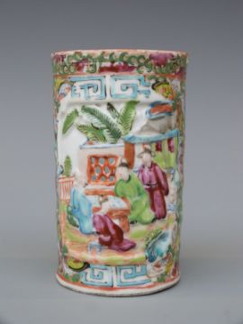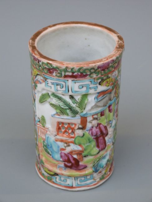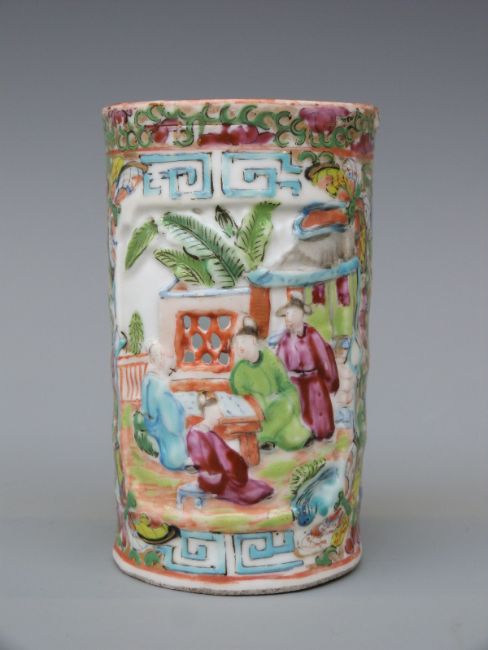 A 19thC Chinese Canton brush pot with relief moulded pierced window decoration, 11cm tall