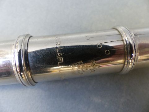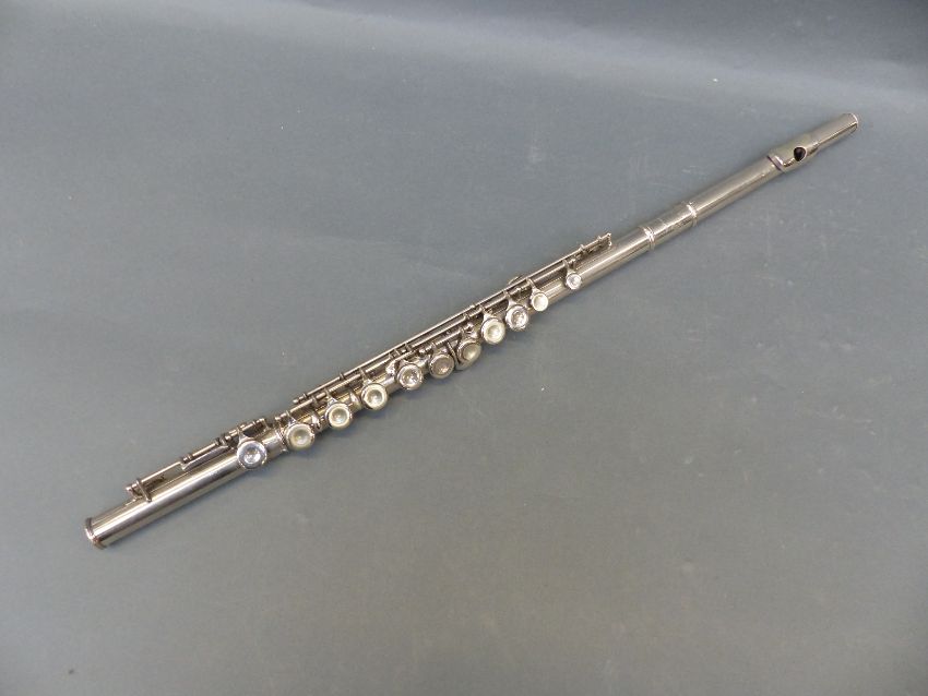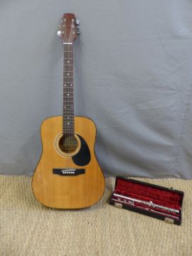 Toledo model no WJ750 acoustic six string guitar with individual tuning pegs, together with a cased Lafleur and Sons flute