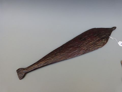 A 19thC Aboriginal wooden spear thrower with carved linear decoration to one side, adzed reverse and gummed tip, 64.5cm long, 13.5cm wide.