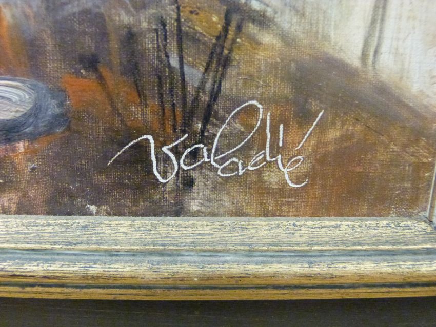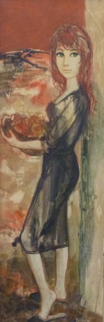 Jean Baptiste Valadie (1933-) framed oil on canvas modernist study of a young woman holding a basket of apples 'Corbeille de Fruits' signed lower right and labelled verso, approximately 74cm x 24cm