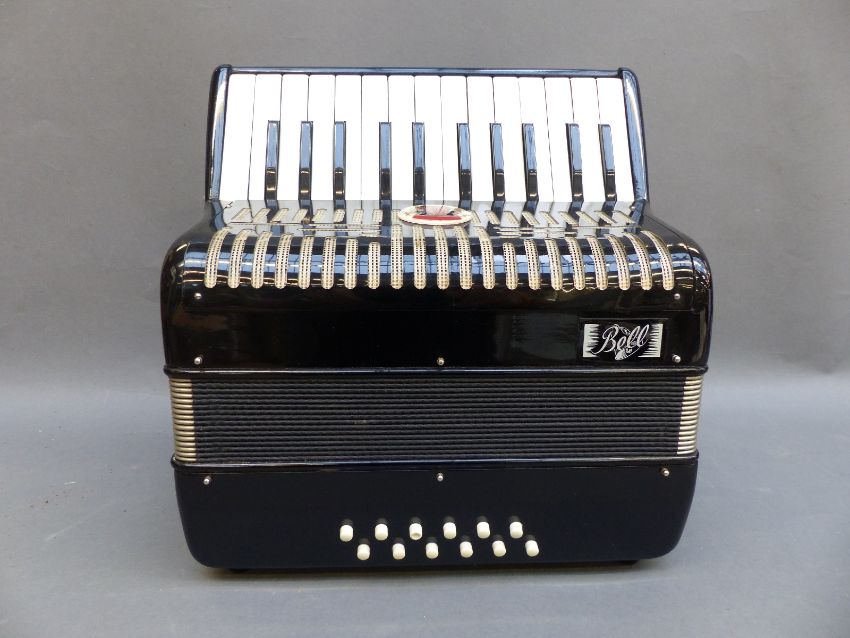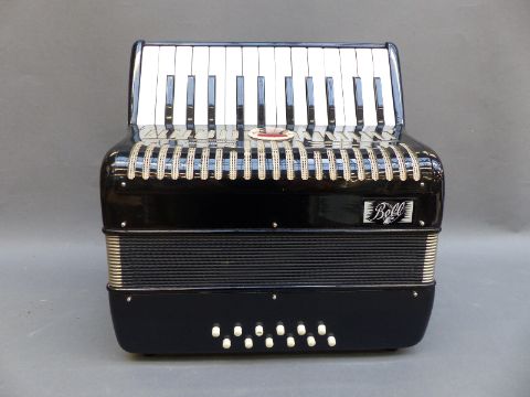 Bell 12 bass piano accordion, made in Italy, in black gloss finish, stamped 10220, in original case