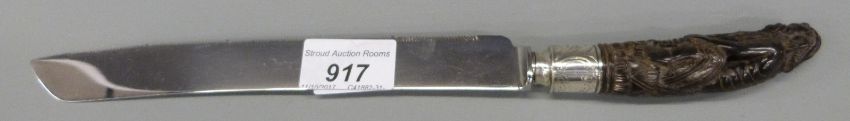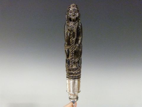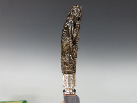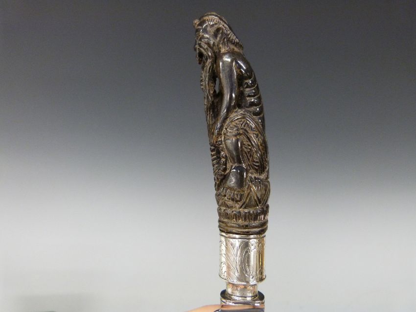 A Chinese carved horn figural handle in the form of an emaciated immortal with white metal mount attached to a knife