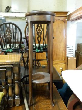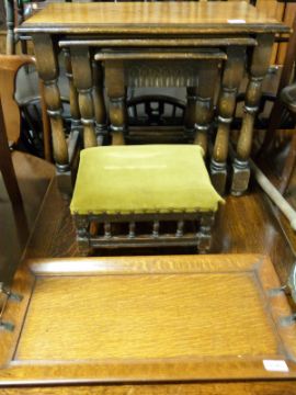 An oak nest of tables, tray, small stool, ottoman, bedpan, and a jardiniere.