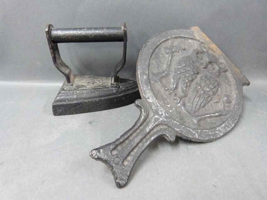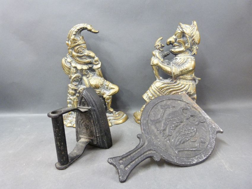 A pair of brass Punch & Judy doorstop's, trivet and iron