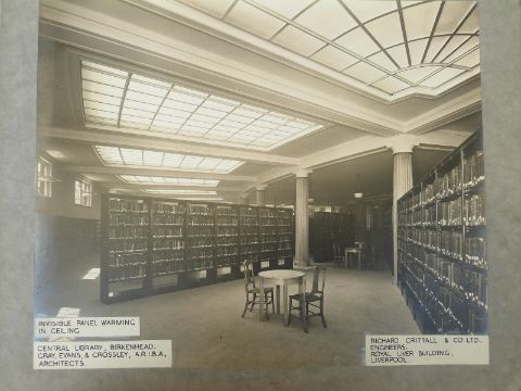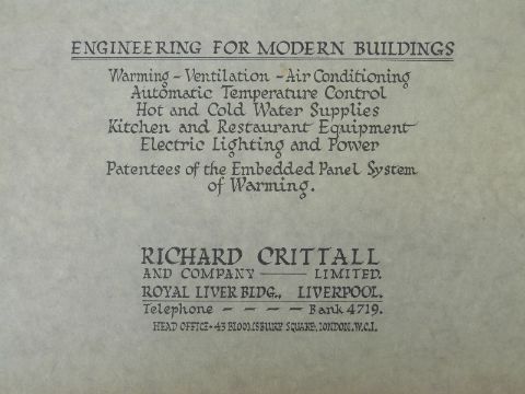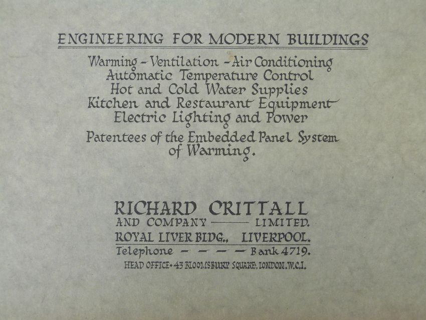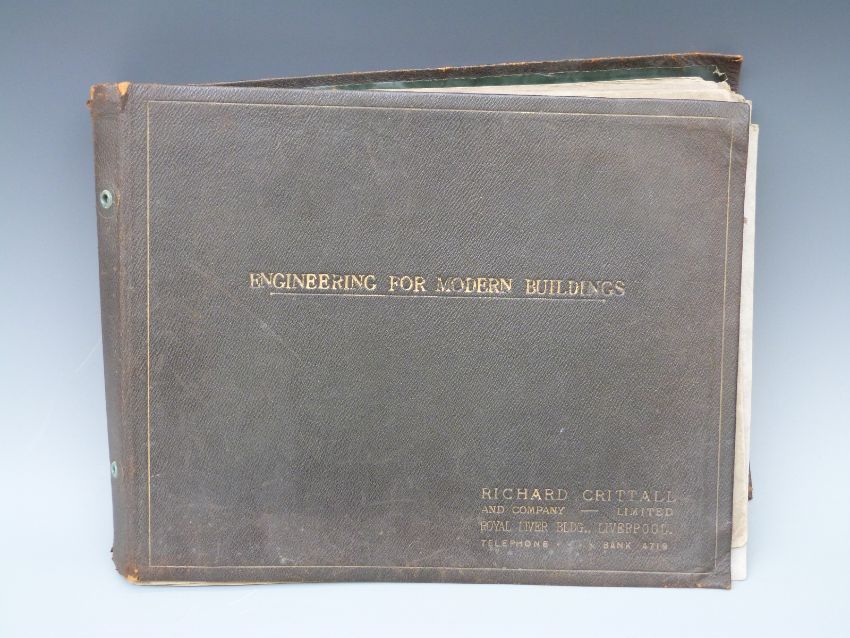 [Trade Catalogue] Richard Crittall and Company, Royal Liver Bldg, Liverpool. Engineering for Modern Buildings, Warming - Ventilation - Air Conditioning, Temperature Control, Water Supplies, Kitchen & Restaurant Equipment, Lighting & Power (c.1940). Album with over 40 large photographic prints of buildings and interiors including The Mersey Tunnel; Bagshaws Jewellers, Martins Bank, Birkenhead Central Library, Chester Town Hall & prison cells, Leeds Civic Hall, engineers cabin Duchess of Richmond etc