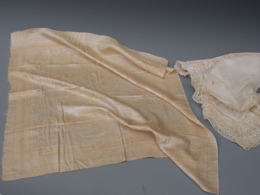 A 19thC gentleman's silk cravat of gold & cream brocade woven with roses and two lace hankerchiefs, cravat approximately 59cm square