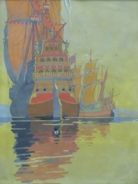 Art Deco watercolour of a galleon signed possibly V. Asta, 26 x 18cm
