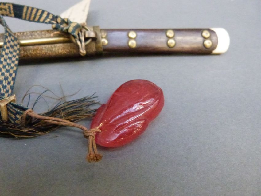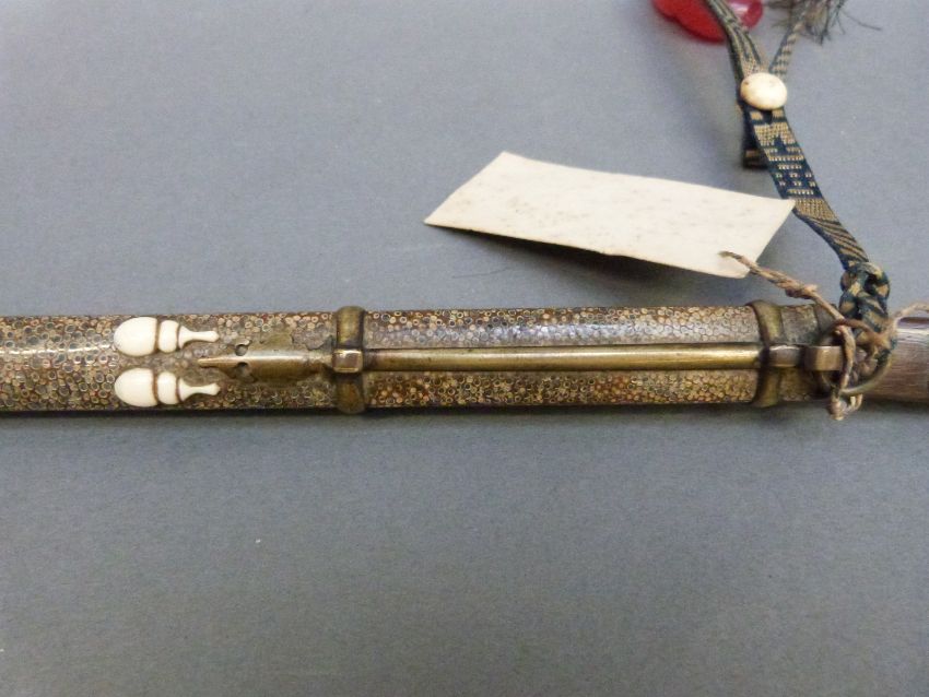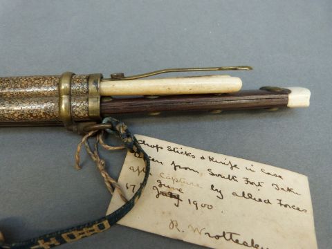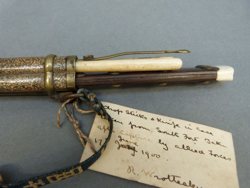 A Chinese eating set in shagreen sheath comprising knife, chopsticks and a further tool, with attached red glass netsuke with label suggesting it to have been removed from Taku South fort after capture in June 1900