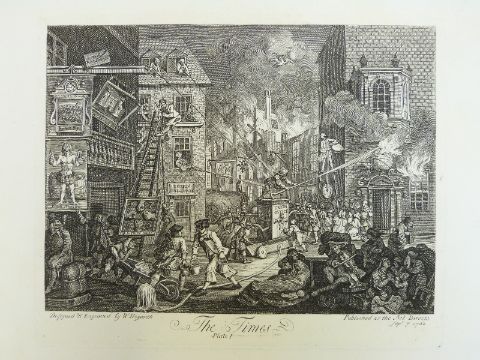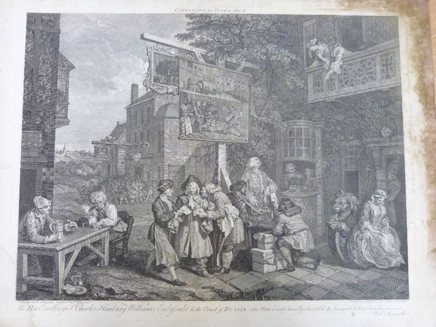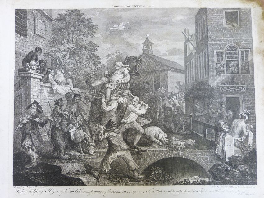 Five political interest Hogarth engravings An Election Entertainment, Canvassing for Votes, Chasing the Members and The Times plates I and II, each approximately 58 x 66cm