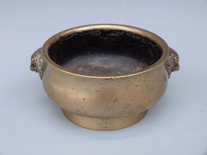Chinese bronze censer with lion mask handles and six character Xuande mark to base, 13.5cm in diameter, The censer was, by repute, brought back to the UK by Richard Gordon Smith a British traveller, sportsman, and naturalist who travelled extensively in the late 19th century and lived in Japan for a number of years