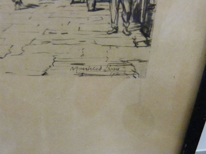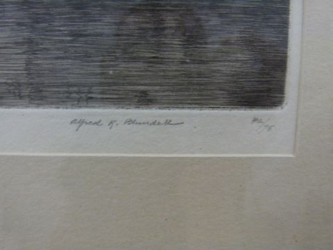 Alfred Blundell signed limited edition engraving 42/75 old houses at Alba, 26 x 37cm and a print of a 19thC Oxfordshire street scene