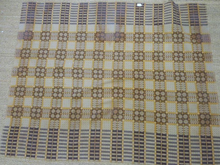 Welsh wool blanket, Caernarfon pattern on an ochre ground, approximately 212cm x 170cm together with a woven chinoiserie panel.