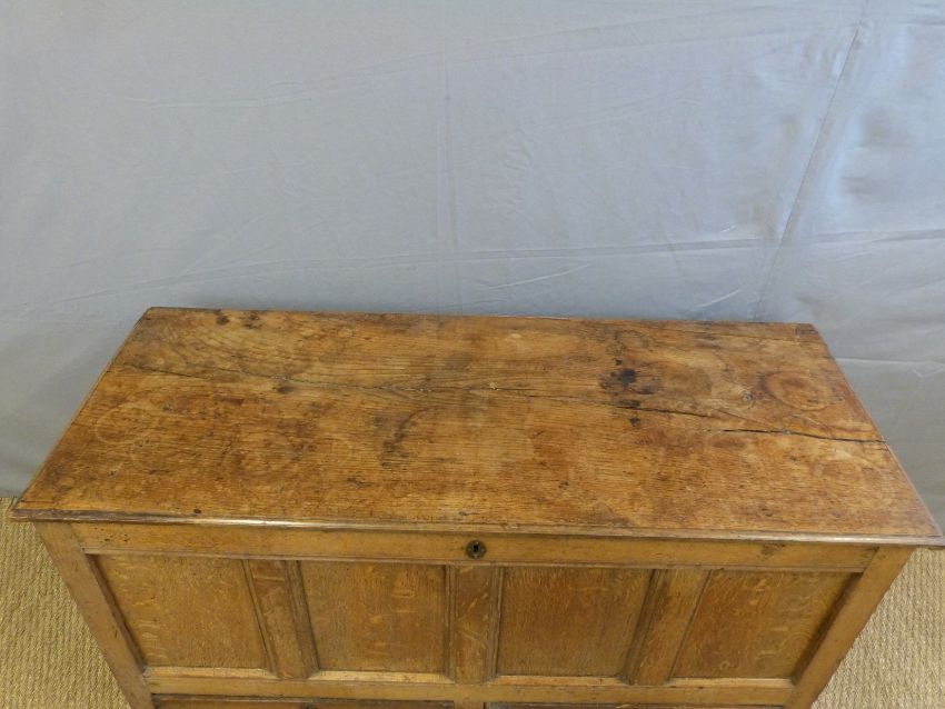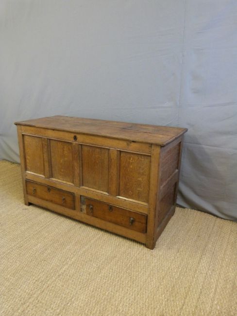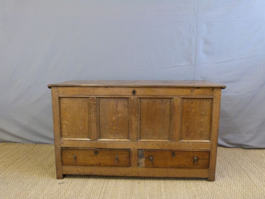An 18thC/19thC oak silver or mule chest with lift up lid and two drawers (H81 x W140 x D55cm)
