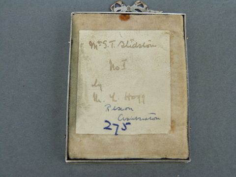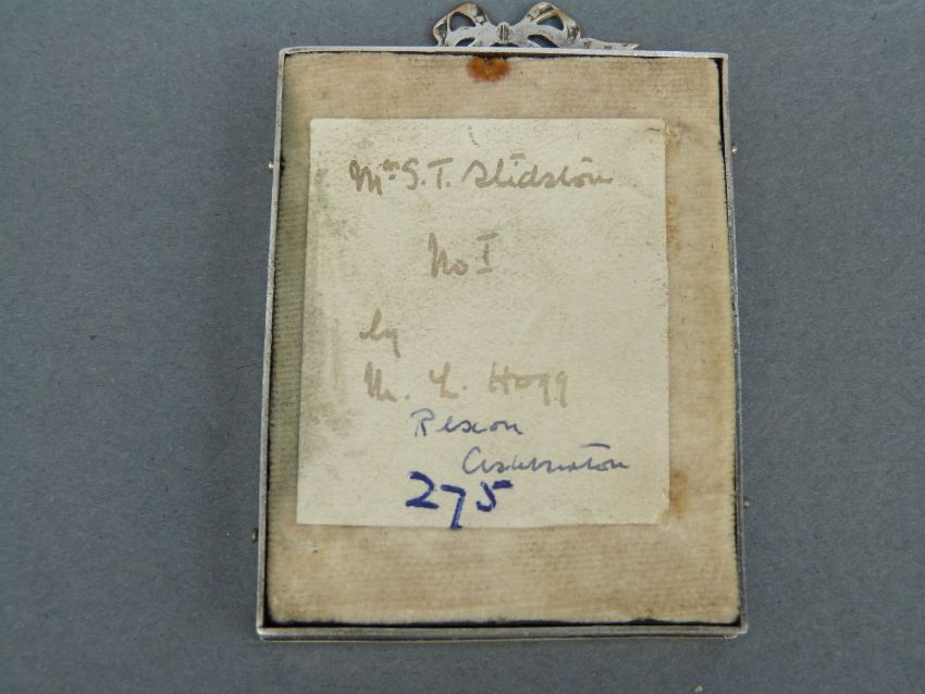 An Art Deco portrait miniature on ivory of a lady, label verso Mrs S. T Stidston No 1 by L. Hogg in white metal frame marked sterling, max height 7cm, in travel case